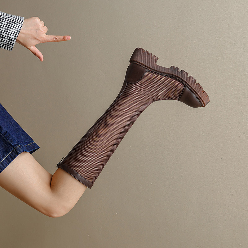 夏季薄款厚底凉靴粗跟长筒网靴镂空透气高筒骑士靴棕色真皮长靴女热门设计联盟服务商
